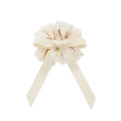 大胆に揺れるリボンが目を惹く、存在感たっぷりのシュシュ。ブラックとホワイトにはコットンレース、イエローにはストライプ、ブルーにはチェック柄を採用し、春らしい軽やかなカラー展開に仕上げました。内側にはゴムを内蔵しているため、髪をまとめてからシュシュ本体を被せることで、より美しいシルエットで着用が可能。アップスタイルにもハーフアップにも映える、着こなしのアクセントにぴったりなアイテムです。