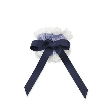 大胆に揺れるリボンが目を惹く、存在感たっぷりのシュシュ。ブラックとホワイトにはコットンレース、イエローにはストライプ、ブルーにはチェック柄を採用し、春らしい軽やかなカラー展開に仕上げました。内側にはゴムを内蔵しているため、髪をまとめてからシュシュ本体を被せることで、より美しいシルエットで着用が可能。アップスタイルにもハーフアップにも映える、着こなしのアクセントにぴったりなアイテムです。