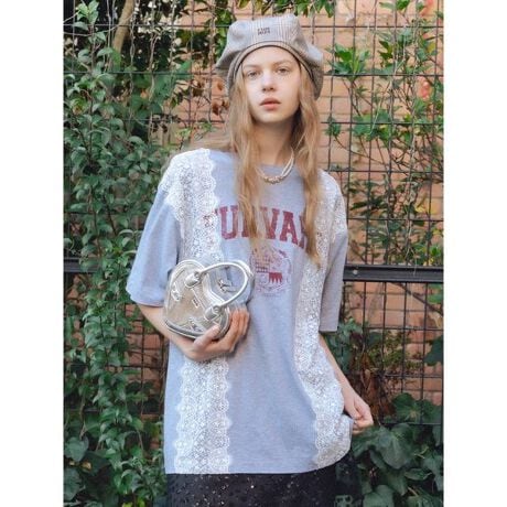 「FURVARD」とプリントされたカレッジTシャツにレースをつけて、リメイク風のデザインにしたTシャツです。フェミニンで上品な印象を持つレースと、古着のような加工をしたプリントのバランスがポイントのアイテムになっております。
