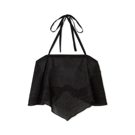 草花モチーフの刺繍と角ばったハンカチ風デザインが特徴のマルチウェイキャミソール。紐や身頃の結び目の位置を調整することで、キャミトップスとしてはもちろん、腰巻きやバンダナなどマルチに使えるアイテム。透け感のあるドライタッチな綿素材を使用し、変形ロゴ刺繍がさりげないアクセントに。