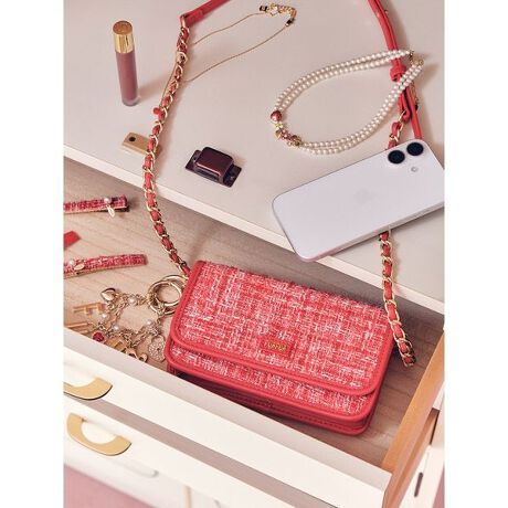 スマートフォンやコスメなどが入る、便利なサイズ感のフォンホルダー。上品で高級感のあるツイード素材がポイント。外側にもポケットをあしらい、使いやすさにこだわりました。同素材のRWGB261513・RWGB261514と合わせてお使いいただくのもおすすめです。