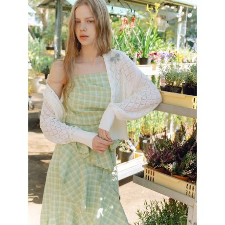 襟元にビーズ刺繍でリボンモチーフをあしらった透かし編みカーディガンです。ベースの透かし編みはトライアングル柄で、リボンのフェミニンさとクリアでモードな印象のバランスが特徴です。クルーネックデザインのため、前を閉じてプルオーバーとしても着用可能。軽やかな透かし編みと繊細な刺繍が、上品で遊び心のあるスタイリングを演出します。