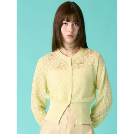 襟元にビーズ刺繍でリボンモチーフをあしらった透かし編みカーディガンです。ベースの透かし編みはトライアングル柄で、リボンのフェミニンさとクリアでモードな印象のバランスが特徴です。クルーネックデザインのため、前を閉じてプルオーバーとしても着用可能。軽やかな透かし編みと繊細な刺繍が、上品で遊び心のあるスタイリングを演出します。