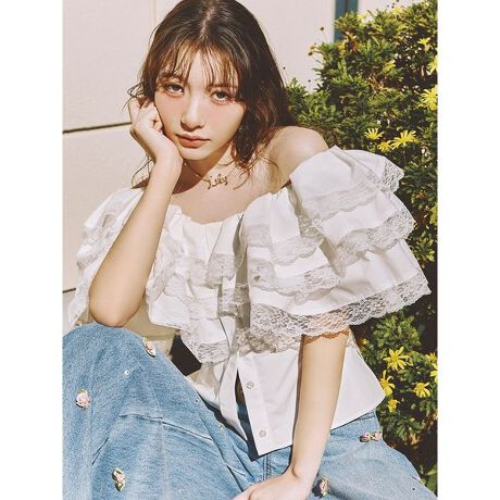 大胆なボリュームが視線を集めるフリルトップス。フリル端には繊細なレーステープをあしらい、華やかな中にも上品さを感じるデザインに仕上げました。内側にゴムを施しているため、オフショルとして着用したり、片側だけ落としてワンショルにしたりとアレンジが可能。さらに、後ろウエストはレースアップリボン仕様で、ご自身のウエストに合わせて細かなサイズ調整ができます。主役級の存在感ながら、着こなしの幅も広い一着です。