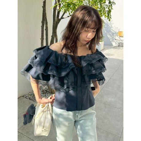 大胆なボリュームが視線を集めるフリルトップス。フリル端には繊細なレーステープをあしらい、華やかな中にも上品さを感じるデザインに仕上げました。内側にゴムを施しているため、オフショルとして着用したり、片側だけ落としてワンショルにしたりとアレンジが可能。さらに、後ろウエストはレースアップリボン仕様で、ご自身のウエストに合わせて細かなサイズ調整ができます。主役級の存在感ながら、着こなしの幅も広い一着です。