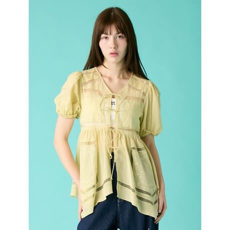 草花モチーフの刺繍やレース切替により繊細な表情を表現したチュニック丈ブラウス。ハンカチをイメージした裾のヘムデザインやピンタックなど、細部までこだわりを感じる一着。透け感のあるドライタッチな綿素材で、軽やかな着心地に仕上げました。
