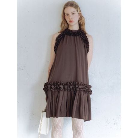 裾プリーツや重ねフリルが華やかなFURFURらしいフェミニンなミニ丈ドレス。アメスリデザインで程よく肌見せしつつ、Aラインシルエットで軽やかな印象に。後ろはボタン開きなので着脱が簡単にできるのもポイント。色展開は華やかなLBLUとベーシックなBLK・BRWでご用意しました。
