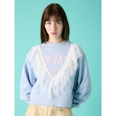 「FURVARD」とプリントされたカレッジスウェットにレースをつけて、リメイク風のデザインにしたスウェットです。フリルのようなフェミニンで上品な印象を持つレースと、古着のような加工をしたプリントのバランスがポイントのアイテムになっております。