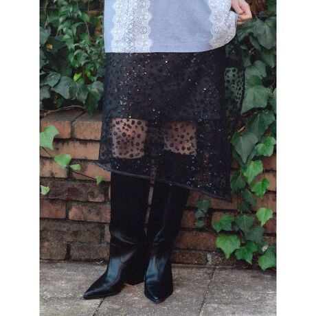 カラーごとに表情の異なるスパンコールを散りばめたチュール素材のラップスカート。ルーズなTシャツやスウェットに重ねるだけでスタイリングが一気に華やぐアイテム。インナーウエストにはピコゴムを施し、チラ見せスタイリングも楽しめるデザインとなっております。普段のコーディネートにプラスするだけで存在感あるレイヤードスタイルを演出いただけます。