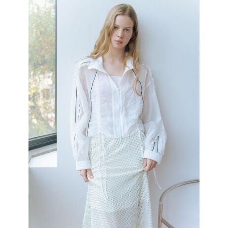 透け感のあるシアーナイロン生地でお作りしたブルゾン。インナーのカラーコーデにより様々な印象でコーディネートを楽しむことができます。共地のフリルやドロストコード、ギャザーによってスポーティーながらフェミニンでモードな一着になっております。コンパクトに畳んで持ち運びもできるので、少し肌寒さの残る初春におすすめの一着。同素材のRWFS261054とセットアップで着用してもおしゃれに決まります。