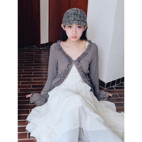 繊細な共地フリルを全体に散りばめた華やかさのあるリブカーディガン。裾部分にはあえて釦を付けないことで抜け感のあるスタイリングが叶います。ネックラインは広めに開いており、レイヤードコーデやアクセサリーとの相性も良く、幅広い着こなしが可能です。両脇にはギャザーデザインを施し立体感を演出。袖口の大きめフリルが動くたびに揺れて女性らしさを引き立てます。