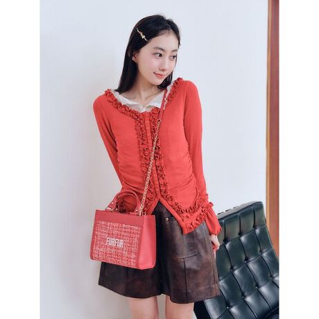 繊細な共地フリルを全体に散りばめた華やかさのあるリブカーディガン。裾部分にはあえて釦を付けないことで抜け感のあるスタイリングが叶います。ネックラインは広めに開いており、レイヤードコーデやアクセサリーとの相性も良く、幅広い着こなしが可能です。両脇にはギャザーデザインを施し立体感を演出。袖口の大きめフリルが動くたびに揺れて女性らしさを引き立てます。
