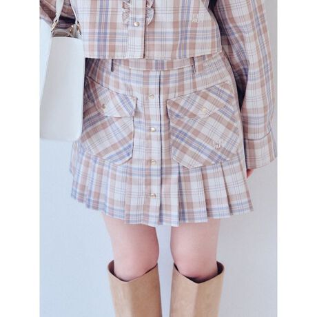 トラッド感漂うチェック柄のミニ丈プリーツスカート。金ドットボタンや同色2段ロゴ刺繍が上品なアクセントに。アウトポケット付きで程よいカジュアル感をプラス。ショートパンツ型の裏地付きで着用の安心感もあるアイテムです。ショートパンツ型の裏地は脇ボタンを開ければパンツとのレイヤードスタイルも楽しめます。同素材のショート丈シャツRWFT261088とのセットアップもおすすめ。