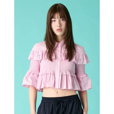 フリルとシャーリングをふんだんに使ったクロップド丈のシャツです。ガーリー過ぎないデザインで、合わせるボトムスによって様々な表情が出るコーディネートしやすいアイテムとなっております。