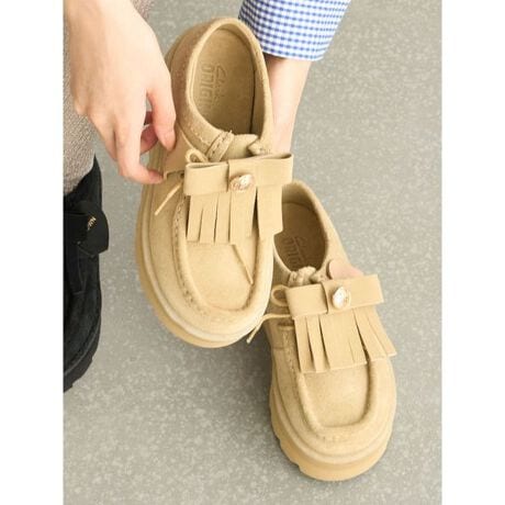 1825年創業の英国フットウェアブランド「Clarks Originals」から、伝統と革新を融合した新モデル「Meare Walla.(メア ワラ.)」が登場。上質なスエードアッパーとスマートなフォルムを生かしつつ、クラシカルな金ボタンをあしらったリボンとタッセルで、ローファーライクなLILY BROWN流カスタマイズを施しました。ハート型のFOBには「LILY BROWN」の箔押しを加え、特別感のある仕上がりに。軽量で柔軟性のあるEVAソールユニットは、快適な履き心地と耐久性の高いトラクションを実現。デイリーからおしゃれを楽しむ日まで、自由なスタイリングに寄り添う一足です。