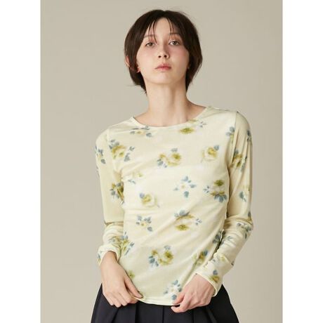 ぼかしフラワー柄にポルカドットを合わせた、トレンドライクなFURFURオリジナルの花柄をプリントしたトップス。起毛感のあるシアーベロアのカットソー生地を使用しており、一枚で着るのはもちろん、ワンピースの下に着たりレイヤードスタイルを楽しむのもおすすめです。
