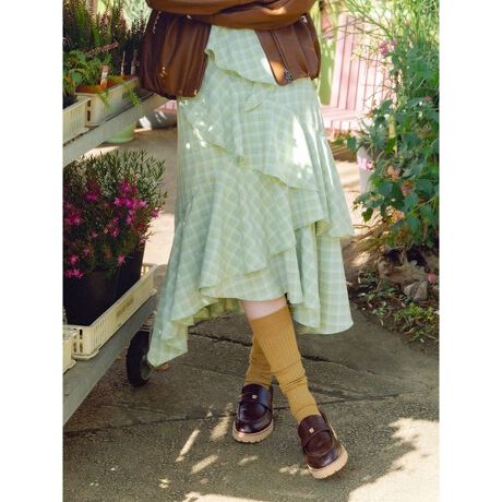 綿ライクな肌触りと各色ごとに異なるテキスタイルを使用したスカート。RWFT261085と同素材なのでセットアップでの着用もおすすめです。アシンメトリーなラッフルフリルをたっぷりと入れて、裾にランダムな動きが出るようにデザイン。ウエストはぐるりゴムでワンサイズ分伸びるようにしておりますが、左脇のコンシールファスナーで着脱可能で、ウエスト周りがもたつかないようにすっきりと仕上げております。裏地も付いているので、透け感も気にならずに着用していただけます。
