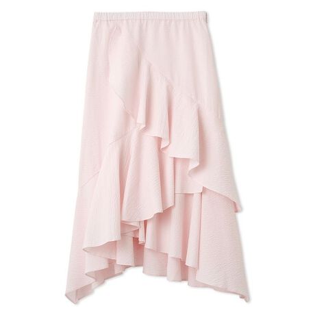 綿ライクな肌触りと各色ごとに異なるテキスタイルを使用したスカート。RWFT261085と同素材なのでセットアップでの着用もおすすめです。アシンメトリーなラッフルフリルをたっぷりと入れて、裾にランダムな動きが出るようにデザイン。ウエストはぐるりゴムでワンサイズ分伸びるようにしておりますが、左脇のコンシールファスナーで着脱可能で、ウエスト周りがもたつかないようにすっきりと仕上げております。裏地も付いているので、透け感も気にならずに着用していただけます。