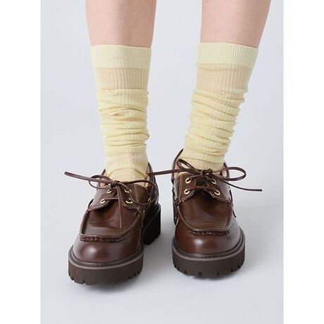 トレンドのデッキシューズを、LILY BROWNらしく厚底でスタイルアップ仕様にアレンジした一足。かかとにはふかふかのパッドを施し、靴ずれを防止。軽量ソールに加え、インソールにもクッション性の高い厚めクッションを入れることで、ふわっと軽やかな履き心地を実現しました。モカ部分にはローファーのディテールを取り入れ、デッキシューズに馴染みがない方でもローファー感覚で挑戦しやすいデザインに仕上げています。金具にはマットゴールドのメッキカラーを採用し、足元にほんのりレディなエッセンスをプラス。カジュアルにもフェミニンにも合わせやすい、今季の万能シューズです。