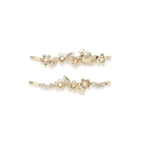 クリスタルや草花、テントウムシをあしらった華やかなヘアピンの二本セット。細かなカーブが施された本体のヘアピンに、異なるデザインを組み合わせた遊び心のあるアイテムです。赤や黄色の彩色が映えるミックスとシンプルな薄金の二種類を展開しています。