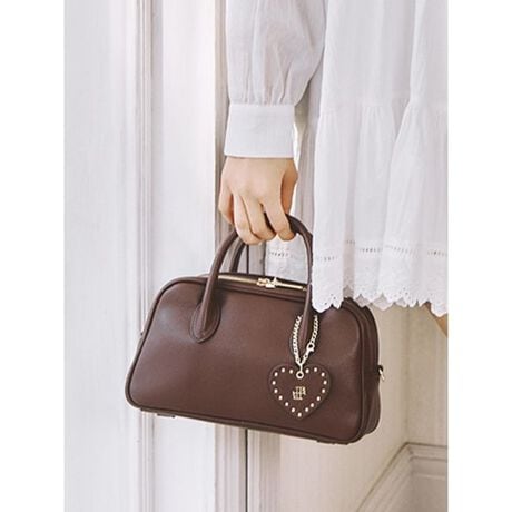 LBロゴモチーフとスタッズをアクセントにあしらった、ハートチャーム付きのボストンバッグ。コンパクトな見た目ながら広めのマチで容量がしっかりあり、デイリー使いにも心強いサイズ感です。さりげないシボ感のあるフェイクレザーを使用することで、上品さと奥行きのある表情をプラス。内ポケット付きで整理がしやすく、取り外し可能なショルダーストラップで2WAY仕様を楽しめます。付属のハートチャームだけでなく、お気に入りのチャームを重ね付けして自分らしくカスタムするのもおすすめ。コーディネートのポイントになる、大人可愛いアイテムです。