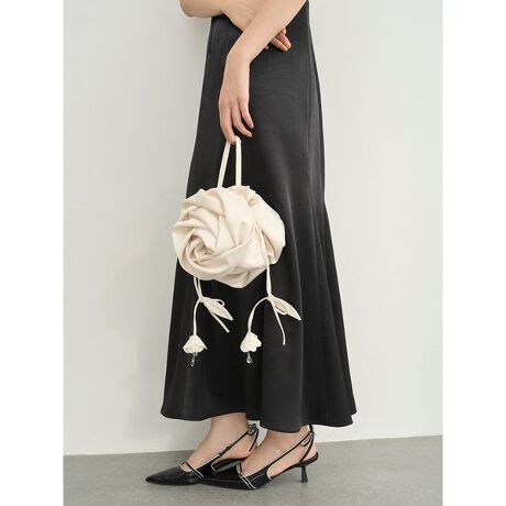 ころんと丸みのあるフォルムが愛らしい、ローズモチーフの立体バッグ。生地を丁寧に立体成形し、本物のバラのような存在感を演出しています。口元はドロスト仕様で、結び紐には葉っぱと花びらをあしらった遊び心のあるデザイン。花びらには朝露のようにきらめくドロップビーズが揺れ、動くたびに上品な華やかさを添えます。小ぶりながらマチがあり、ミニ財布・スマホ・小さめポーチが収まる実用的なサイズ感。ハンドルには取り外し可能なロゴ入りキーホルダーが付き、アクセントとしても楽しめます。オケージョンからカジュアルまで、幅広いスタイリングにマッチする主役級アイテムです。