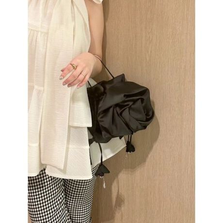 ころんと丸みのあるフォルムが愛らしい、ローズモチーフの立体バッグ。生地を丁寧に立体成形し、本物のバラのような存在感を演出しています。口元はドロスト仕様で、結び紐には葉っぱと花びらをあしらった遊び心のあるデザイン。花びらには朝露のようにきらめくドロップビーズが揺れ、動くたびに上品な華やかさを添えます。小ぶりながらマチがあり、ミニ財布・スマホ・小さめポーチが収まる実用的なサイズ感。ハンドルには取り外し可能なロゴ入りキーホルダーが付き、アクセントとしても楽しめます。オケージョンからカジュアルまで、幅広いスタイリングにマッチする主役級アイテムです。