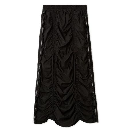 透け感のあるシアーナイロン生地でお作りしたスカート。共地のフリルやたっぷりと入ったギャザーにより動きのあるシルエットが特徴になっております。スカート自体の形はタイトなIラインをベースにしているので着用しやすい形です。前後のドロストリボンによりスカートの丈感を調整する事ができます。ミニスカート丈の裏地がついており、程よく肌見せができて抜け感のあるコーディネートが楽しめるアイテムになっております。同素材のRWFJ261053とセットアップで着用するのもおすすめ。