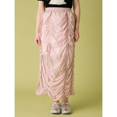 透け感のあるシアーナイロン生地でお作りしたスカート。共地のフリルやたっぷりと入ったギャザーにより動きのあるシルエットが特徴になっております。スカート自体の形はタイトなIラインをベースにしているので着用しやすい形です。前後のドロストリボンによりスカートの丈感を調整する事ができます。ミニスカート丈の裏地がついており、程よく肌見せができて抜け感のあるコーディネートが楽しめるアイテムになっております。同素材のRWFJ261053とセットアップで着用するのもおすすめ。