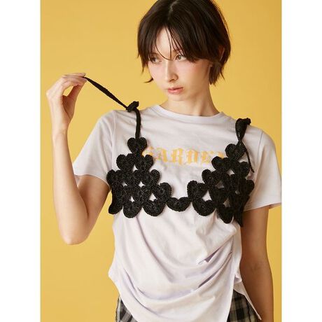 かぎ針編みで手作りした小さなハートモチーフをつなぎ合わせたニットブラレットです。一つ一つ丁寧に編まれたモチーフが、繊細で可愛らしい印象を与えます。シンプルなカットソーやシャツとの重ね着で、遊び心のあるスタイリングを楽しめます。肩紐と後ろの紐でサイズ調整が可能なため、フィット感を自由に調整できます。