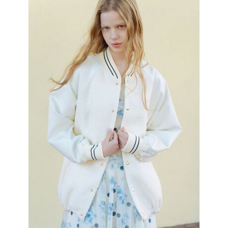 ツイードと合皮を組み合わせたミディ丈のスタジャン。裾にリブはなくドローコードが入っている仕様のため、裾を絞ってギャザーを寄せたシルエットとフレアシルエットの2パターンお楽しみいただけます。フロントの金ボタンでさらに女性らしい印象に。表地同色のロゴ刺繍やリブの配色細ラインがさりげないアクセント。裏地付きで着心地も良く、ベーシックから華やかな色まで豊富なカラーバリエーションをご用意いたしました。