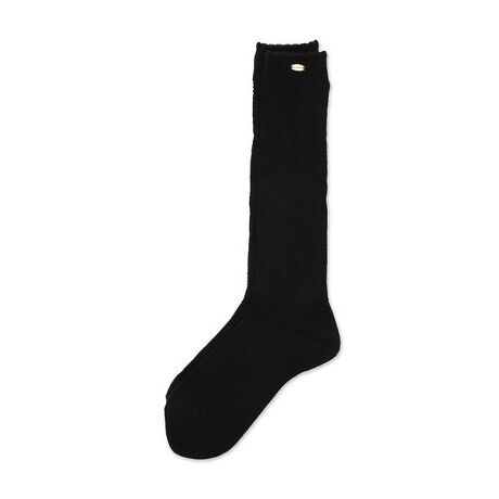 オリジナルのダイヤ柄透かし編みが目を惹くハイソックス。柔らかな綿混素材で、季節を問わず快適に着用できる心地よさが魅力です。膝下丈でバランスが取りやすく、履き口にはスカラップリブをあしらい、さりげない愛らしさをプラスしました。ゴールドのロゴプレートが上品なアクセントとなり、パンプス・ローファー・スニーカーなど、どんなスタイルにも合わせやすい万能デザイン。ホワイトとブラックの2色展開です。