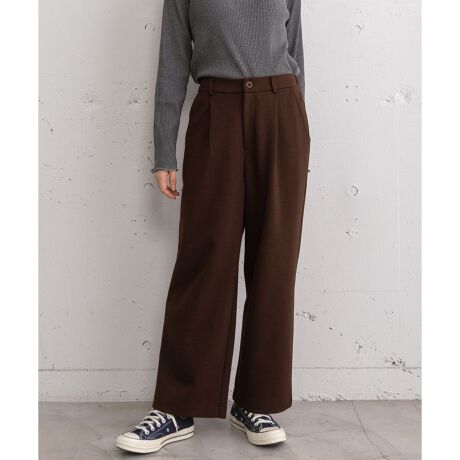 スラックスのようなきちんと感があるパンツ。ポンチ素材ならではの、スウェットのような快適な履き心地が魅力です。タックを深めに入れているので腰回りと太もものラインを拾わず、縦のラインを強調してスタイルアップ効果も期待できます。程よい厚みでハリ感のある素材で型崩れしにくくシワも気になりません。両サイドポケット付き。ヒップの箱ポケットはフェイクデザインです。