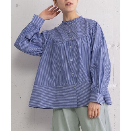 ラウンドヨークでたっぷり寄せたギャザーのふんわりシルエットが春らしいブラウス。裾の切替えデザインで張りを出し立体的なシルエットになるようにしています。ストライプは地の目を横にし、デザインのアクセントにしています。フレアを入れ動きのあるデザインに仕上がりました。首周りのフリルデザインで重ね着した時にもポイントになります。