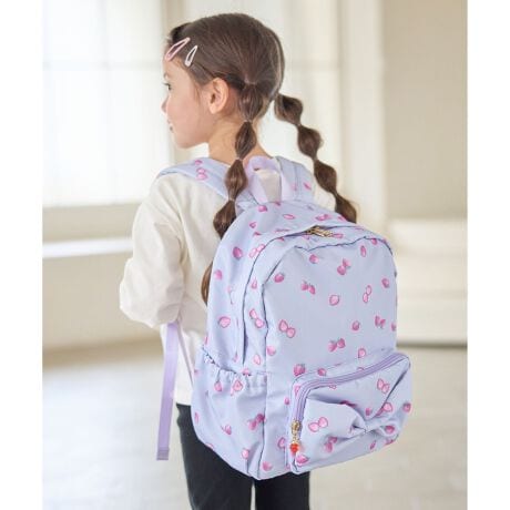 いちごの総柄デザインがパッと目を引く、ガーリーなキッズリュック。