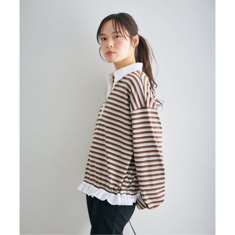 カジュアルなボーダーカットソーに、フリルを施してフェミニンさをプラスした一着。 衿、前立て、裾にシャツ地を使用し、まるでフリルブラウスをレイヤードしているような凝ったデザインに仕上げました。
