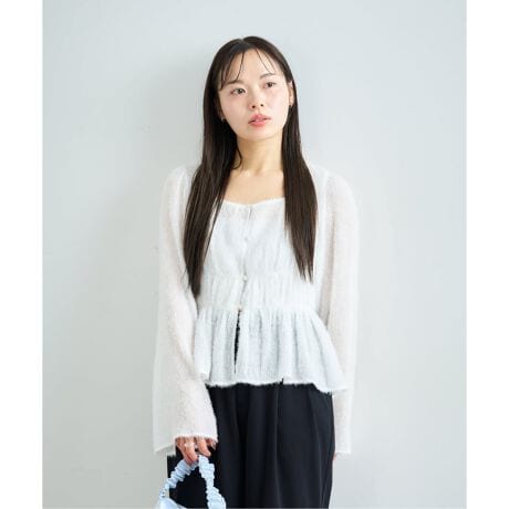 ・透け感のあるシャギー素材を使用し、ほどよい華やかさと立体感を持たせています。ウエストのシャーリングがシルエット全体にリズムを生み、トップス一枚でスタイルが決まります。