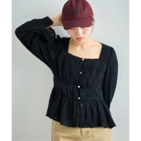 ・透け感のあるシャギー素材を使用し、ほどよい華やかさと立体感を持たせています。ウエストのシャーリングがシルエット全体にリズムを生み、トップス一枚でスタイルが決まります。
