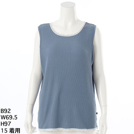 [型番:6702101]肌触りの良いテレコ生地を使用したタンクトップ。襟ぐりと裾にツヤ感の有るレースを付けポイントにしています。襟ぐりや裾からちらっと見えて素敵です。左脇にGNテープ付き。グリーンノート 大きいサイズ レディース ゆったり タンクトップ レース テレコ 6702101