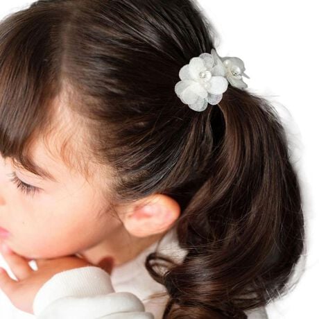 ふわふわと舞い落ちる雪の結晶をイメージした「スノーフラワーヘアクリップ」。透明感あふれる可憐なフラワーデザインが、お子様のヘアスタイルを華やかに演出します。透け感のある花びらは、まるで本物の雪の結晶のよう。中央にはきらりと輝くラインストーンと上品なパールがあしらわれ、小さくても存在感たっぷり。着脱簡単なクリップ式だから、忙しい朝でもサッとヘアアレンジが完成!細い髪にもしっかりフィットし、ずれ落ちる心配も少ないのが嬉しい♪2個セットなので、両サイドにつけたり、ポニーテールに重ねづけしたりと、様々なアレンジが楽しめます。発表会やお誕生日、ちょっとしたお出かけにも。幅広いシーンで大活躍間違いなしのアイテムです。