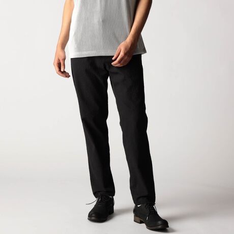 ウエスト、イージー仕様のスラックスデザインパンツ。ウエストベルトには平ゴムとスピンドルを通しています。ベルト裏にはジャカード裏地をアクセントに使用、内側の袋布などストレッチ裏地を使用して表地に追従するストレスフリーな穿き心地、清涼感を高めます。ロゴ入り釦やオリジナルDカンを採用して差別化を図っています。