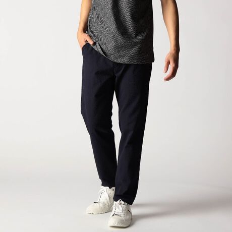 ウエスト、イージー仕様のスラックスデザインパンツ。ウエストベルトには平ゴムとスピンドルを通しています。ベルト裏にはジャカード裏地をアクセントに使用、内側の袋布などストレッチ裏地を使用して表地に追従するストレスフリーな穿き心地、清涼感を高めます。ロゴ入り釦やオリジナルDカンを採用して差別化を図っています。