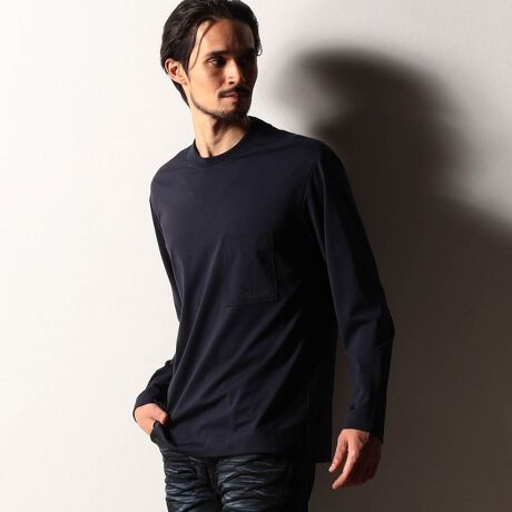 前身のパッチポケットがデザインアクセントのクルーネックカットソー。