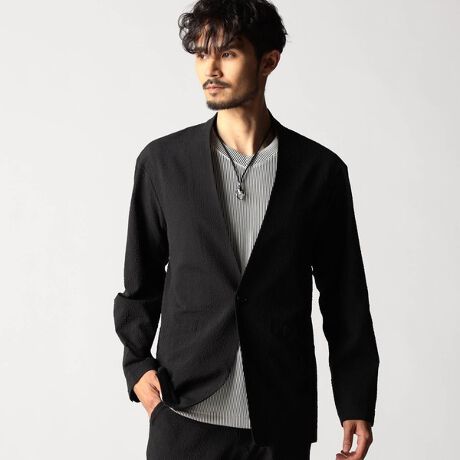 ノーカラーの1Bジャケット。首元が開き過ぎない様にVゾーンを狭く設定、腰ポケットをシンプルな箱ポケットにする事で、ドレカジライクな綺麗めのシンプルジャケットに作りました。前身の裏に裏地を付けて内ポケットを作り、軽く仕上げています。