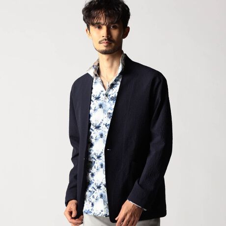 ノーカラーの1Bジャケット。首元が開き過ぎない様にVゾーンを狭く設定、腰ポケットをシンプルな箱ポケットにする事で、ドレカジライクな綺麗めのシンプルジャケットに作りました。前身の裏に裏地を付けて内ポケットを作り、軽く仕上げています。