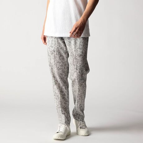 イージーパンツ仕様のスラックスデザイン。折り山プレスを入れてドレカジライクに仕上げています。ベルト裏にはジャカード裏地をアクセントに使用、内側の袋布などストレッチ裏地を使う事で、表地に追従するストレスフリーな穿き心地、清涼感を高めています。右後ろにモバイルポケットを設け、ロゴ入り釦やオリジナルDカンを採用して差別化を図っています。19ライトグレーのみ透け防止の膝裏を付けています。