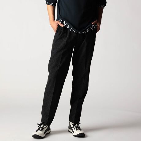 イージーパンツ仕様のスラックスデザイン。折り山プレスを入れてドレカジライクに仕上げています。ベルト裏にはジャカード裏地をアクセントに使用、内側の袋布などストレッチ裏地を使う事で、表地に追従するストレスフリーな穿き心地、清涼感を高めています。右後ろにモバイルポケットを設け、ロゴ入り釦やオリジナルDカンを採用して差別化を図っています。19ライトグレーのみ透け防止の膝裏を付けています。
