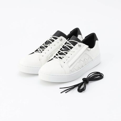 白と黒のコンビ使いした配色カラー、少し細長いシャープな木型(ラスト)に、厚みのあるモールドソールでトレンド感のある大人スニーカーです。