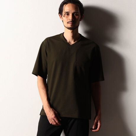 浅めのネックデザインにフロントのパッチポケットで遊びを効かせたVネックカットソー。