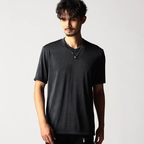 落ち感のあるタックボーダー素材をストライプ使いしたVネックカットソー。
